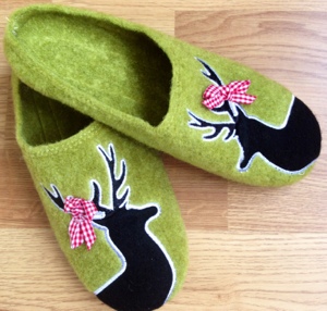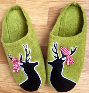 …nicht die singenden, sondern diese, die wir Schweizer für die Füsse benutzen, also Hausschuhe. Zu Hause lauf ich fast immer in Socken oder barfuss rum. Auch wenn es an der Türe klingelt oder ich in den Keller muss, dann geh ich immer in den Socken. Manchmal sind Hausschuhe einfach praktisch bzw. nötig. Nämlich dann, wenn ich ein Wochenende in einem Ferienhaus oder -wohnung verbringe. Und ja, es sollten Hausschuhe sein, mit dehnen ich mich zeigen kann. Ganz spontan habe ich am Freitag dieses Problem gelöst und ich liebe meine neuen Finken!!! Sind sie nicht süss?