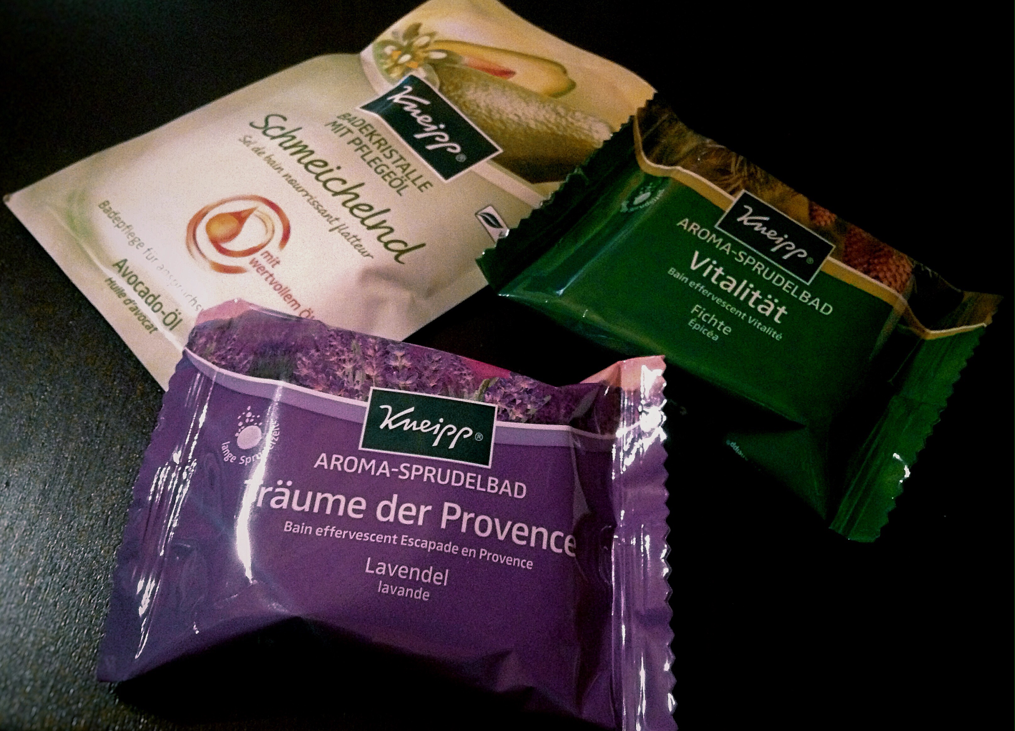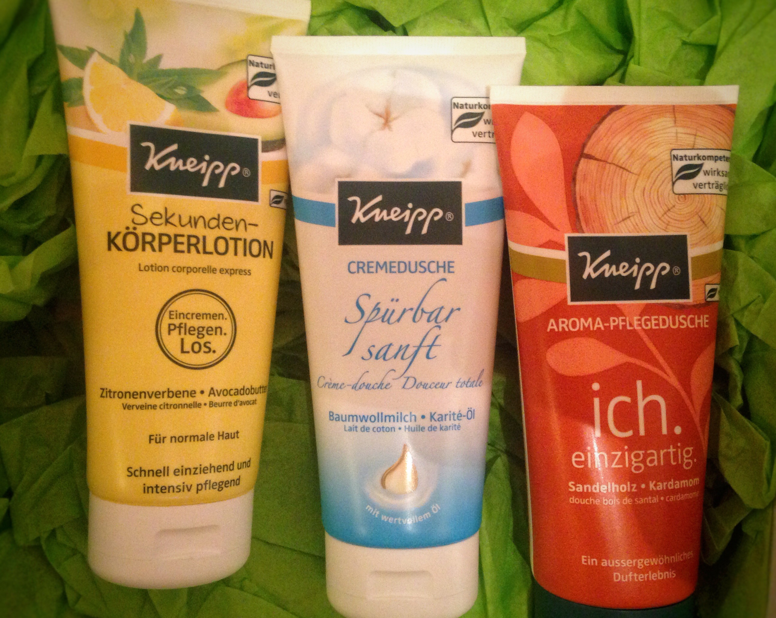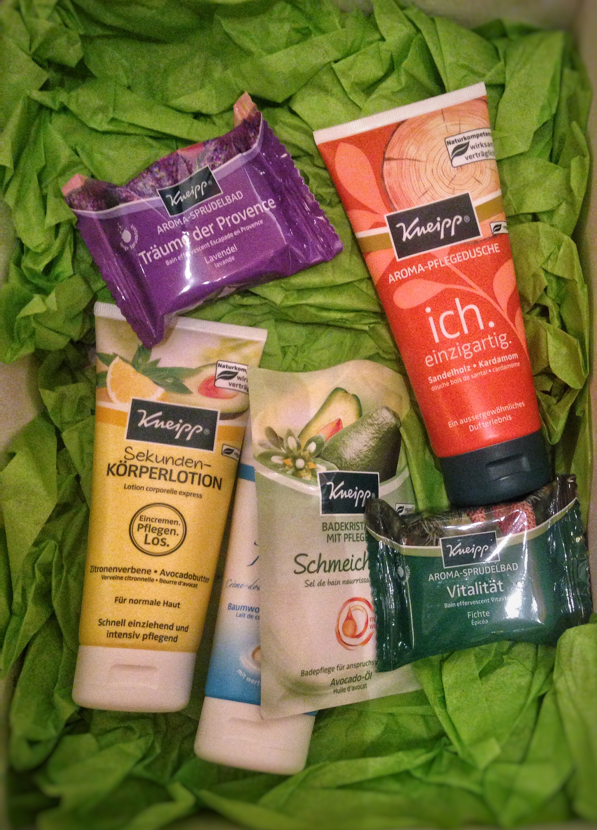 Darin enthalten sind zwei Kneipp Aroma-Sprudelbäder, eine Aroma-Pflegedusche, eine Cremedusche, einmal Badekristalle und dann noch eine Sekunden-Körperlotion. Welch schöne Überraschung zu Beginn der Woche!