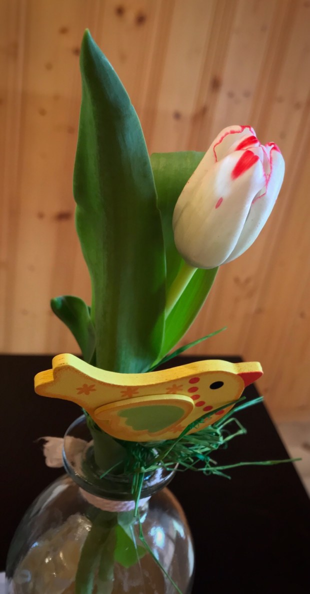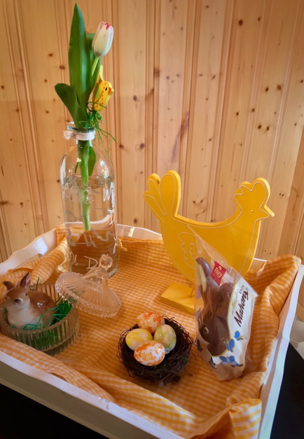 Hach, vielleicht ist es wegen dem Sch…Wetter, dass ich in diesem Jahr keine Lust hatte, Osterdeko aufzustellen. Ostern rückt immer näher und so überlegte ich mir, ob ich überhaupt noch die Dekoration aus dem Schrank räumen soll. Mein Mann sagte schnell: „Also wegen mir musst du nicht dekorieren.“ Jaaaa, war ja klar ;-) Doch, irgendwie wollte ich doch. Es war ein Hin und Her von Gedanken. Eigentlich so sinnlose Gedanken. Denn Osterdeko ist nun wirklich nicht überlebenswichtig. Aber doch schön. Also, ich dekoriere doch noch ein bisschen. So haben wir wenigstens ein bisschen Frühling in der Wohnung. Trotzen wir also den winterlichen Temperaturen. Der Entscheid ist gefallen. Dekorieren will ich. Doch wie? Frage mal Google, Instagram und Pinterest. Huuuch, ganz viele aufwendige Ostereier könnte ich gestalten. Will ich aber nicht. Ich schaue lieber was noch vom letzten Jahr vorhanden ist und kombiniere dies mit einem Schoggihasen (der wird nicht lange überleben ;-) und frischen Blumen. Keine Wahnsinns-Deko und dennoch tut dieses Neue, aber eigenlich gar nicht Neue, gut.